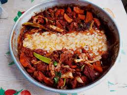 This dish brings together marinated chicken, cabbage, sweet potatoes, rice cakes, and chili paste, all stir-fried in one big pan. It’s a sweet-spicy delight, often shared in groups.